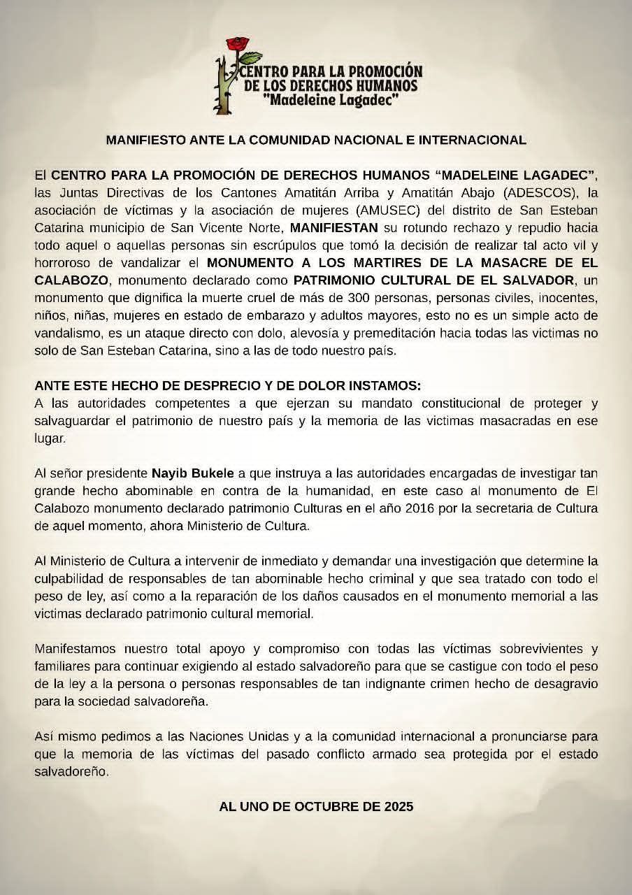 El Centro para la Promoción de los Derechos Humanos, CPDH "Madeleine Lagadec", se pronunció ante los hechos ocurridos en contra del Monumento a las Víctimas de la Masacre de El Calabozo en San Esteban Catarina, departamento de San Vicente.